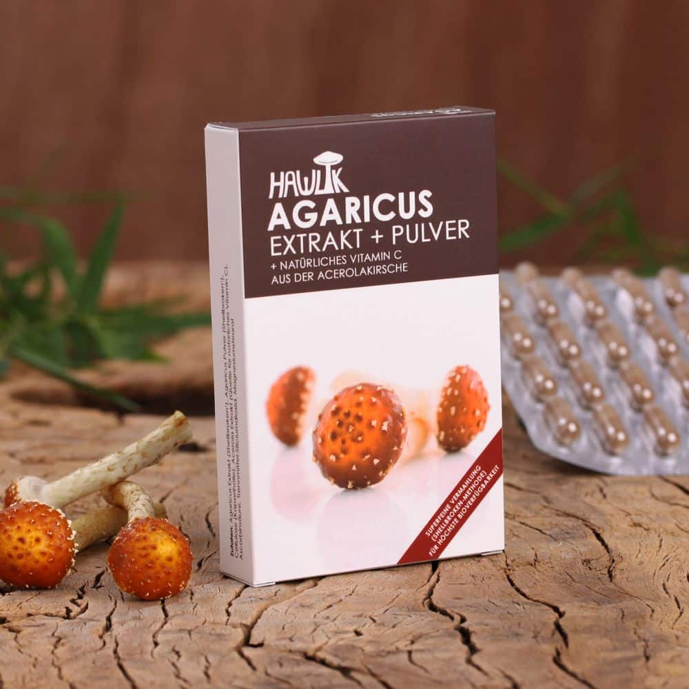Mischung aus Agaricus Extrakt und Pulver mit pilztypischen Polysacchariden. Agaricus Pulver: Der gesamte Fruchtkörper des Pilzes wird geerntet, schonend getrocknet und dann nach der Shellbroken-Methode vermahlen. Das Ergebnis ist ein superfeines Vitalpilzpulver mit allen natürlichen Bestandteilen. Agaricus Extrakt: Aus dem Agaricus Pulver wird mittels eines aus der Traditionellen Chinesischen Medizin bekannten Verfahrens, bei dem die im Chitingerüst des Pilzes gebundenen Polysaccharide herausgelöst werden, ein Extrakt gewonnen. Dieses Verfahren macht die Polysaccharide für den Körper besser verfügbar. Damit vereint die Hawlik Extrakt + Pulver Mischung das Optimum beider Darreichungsformen. Deshalb ist es auch seit Jahren im Einsatz und bei unseren Kunden hoch geschätzt. Jede pflanzliche Kapsel enthält 250 mg Vitalpilz Extrakt, 150 mg Vitalpilz Pulver und 8,5 mg natürliches Vitamin C. und trägt zum persönlichen Wohlbefinden bei!