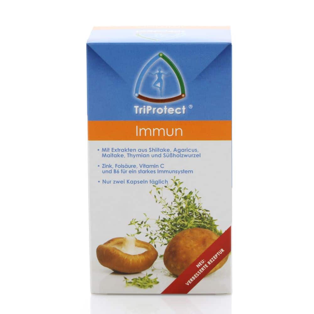 Mit Extrakten aus Shiitake, Agaricus, Maitake, Thymian und Süßholzwurzel Zink, Folsäure, Vitamin C und B6 für die normale Funktion des Immunsystems Nur zwei Kapseln täglich Eine abwechslungsreiche Ernährung, ein gesundes Bewegungsprogramm und (laut Deutscher Gesellschaft für Ernährung e. V.) fünf Portionen Obst und Gemüse pro Tag sind eine gute Basis für ein gesundes Immunsystem. Doch gibt es auch oft Gründe, warum diese Regel nicht eingehalten werden kann. Ob aus Mangel an Zeit oder aufgrund von vitamin- und mineralstoffarmem Gemüse (z. B. nicht-saisonale Ware). Deshalb kann eine gezielte Nahrungsergänzung sinnvoll sein. Immun TriProtect enthält hochwertige Extrakte aus Thymian und Süßholzwurzel, aus den Vitalpilzen Maitake, Shiitake und Agaricus blazei Murrill sowie eine abgestimmte Kombination von verschiedenen Vitaminen und Mineralstoffen. Achten Sie auf eine gesunde Lebensweise und tun Sie sich selbst etwas Gutes.