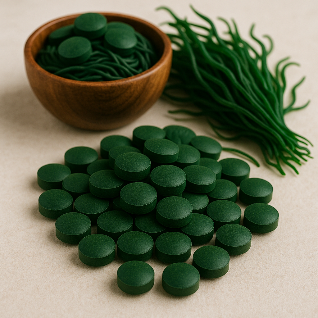 BIO-Spirulina aus kontrolliertem Anbau. Rückstandsgeprüft und zertifiziert. BIO-Spirulina enthält einen hohen Anteil an Beta-Karotinoiden und Chlorophyll. Die Farbe ist dunkelgrün. Der Geschmack nussig. Die Tabletten werden ohne Zugabe von Zusatzstoffen, nur aus dem reinen Spirulinapulver hergestellt.